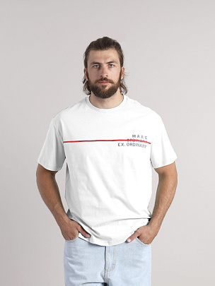 Гладкокрашенная майка с плечом. Горловина и проймы обработаны окантовкой из основного полотна. Перед оформлен шелкографией.