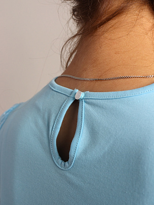 Джемпер для девочки с длинными рукавами и отложным воротником. Рукава из сетки с манжетами из кулирки. Полочка двойная - нижний слой из кулирки, верхний из сетки. Сзади застежка на пуговицу.