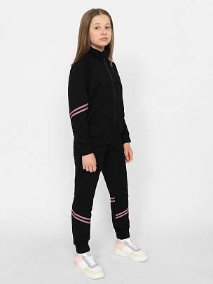 Костюм для девочки с лампасами. Толстовка на молнии и брюки-джоггеры из футера, манжеты и пояс с резинкой. Толстовка с рукавом-реглан, с воротником-стойкой. Спереди карман-кенгуру. Контрастные лампасы на рукавах и брюках добавляют элемент спортивности. Свободный крой костюма не стесняет движений и позволяет ребенку чувствовать себя уютно и комфортно. Костюм создан в спортивном стиле, для активных и энергичных.