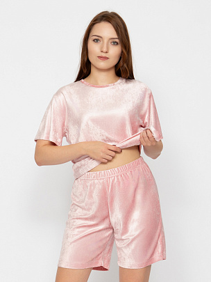 Костюм изготовлен из высококачественного бамбукового велюра. Футболка свободного силуэта с коротким рукавом, шорты свободного кроя с поясом на мягкой резинке. Ткань переливается и меняет оттенок в зависимости от освещения. Костюм женский подчеркнёт индивидуальность, привлекательность и нежность своей обладательницы.